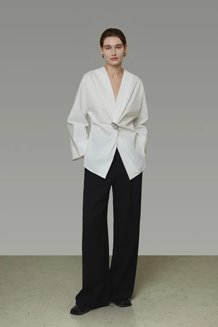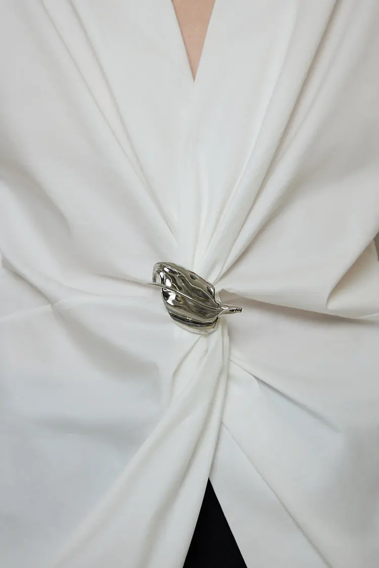 মহিলাদের মেটাল বাকল পার্টি ব্লাউজে সাজসজ্জার জন্য ত্রি-মাত্রিক ধাতব বোতামগুলির সাথে মিলিত একটি অপ্রতিসম কোমরের গিঁট রয়েছে। ভিজ্যুয়াল ফোকাস বিশিষ্ট, স্বাভাবিকভাবেই কোমররেখা ছিন্ন করে এবং বক্ররেখা হাইলাইট করে। এটি চিত্রটিকে নরম করার জন্য প্লিট ব্যবহার করে, বিভিন্ন ধরণের শরীরের জন্য উচ্চ মাত্রার নমনীয়তা সরবরাহ করে। ক্রস করা V-নেকটি ঝরঝরে এবং মার্জিত, একটি খাস্তা এবং মসৃণ ফ্যাব্রিক যা হালকা ওজনের এবং ভেঙে পড়ে না। এটি একটি পার্টি টপের ফ্যাশন আপিলের সাথে দৈনন্দিন পরিধানের জন্য একটি শার্টের ব্যবহারিকতাকে একত্রিত করে, যা বহুমুখী পরিধান এবং শক্তিশালী চাক্ষুষ স্বীকৃতির জন্য অনুমতি দেয়।