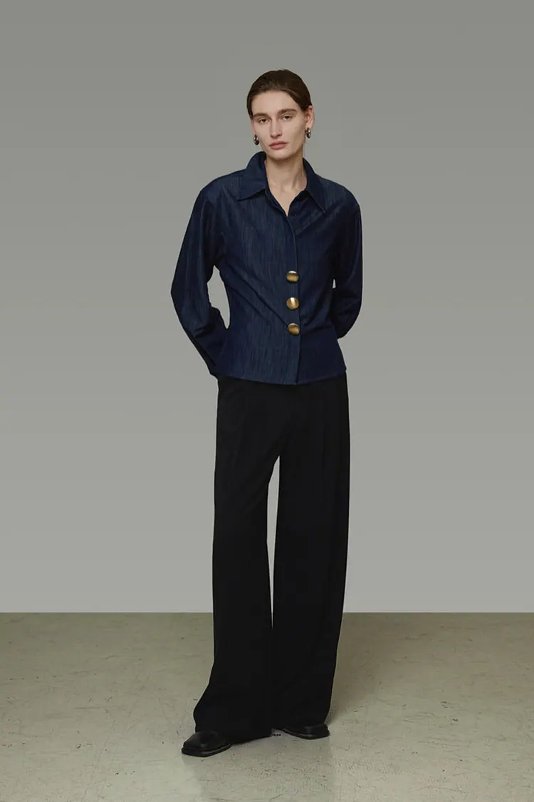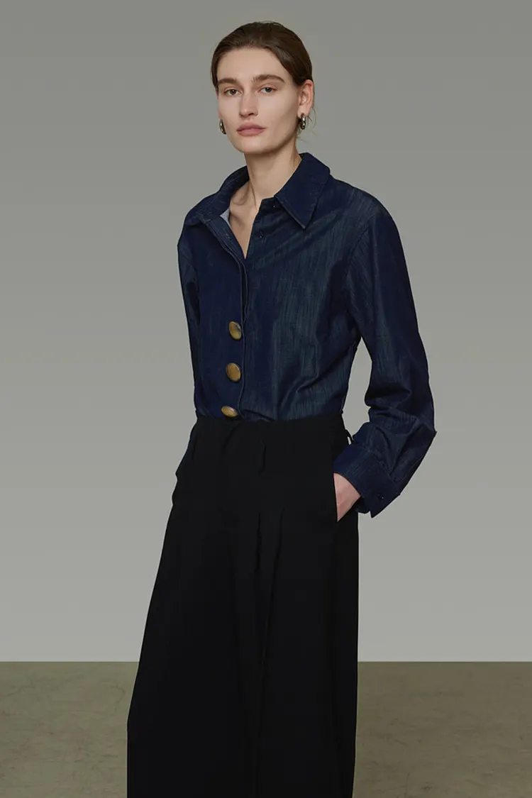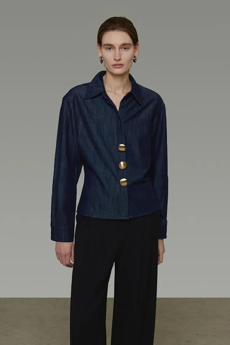 মেটাল বোতাম সহ মহিলাদের ভিনটেজ ডেনিম শার্ট, সহজ এবং সূক্ষ্ম লম্বা হাতা বহুমুখী শীর্ষ